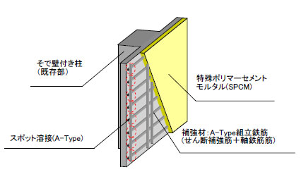 「サイド・ポ・スト工法」は、住宅基礎用鉄筋として既に開発・実用化されている「組立鉄筋Aタイプ」(せん断補強筋と主筋とをスポット溶接により接合し、その溶接接合点のせん断補強筋のせん断強度は規格降伏点強度以上であること、せん断実験後に主筋の引張試験を行い、規格降伏点強度および規格伸びを確保することができるように研究開発されている)と特殊ポリマーセメンモルタルによって、既存RC造躯体と一体化させるものです。特殊ポリマーセメンモルタルの接着力により組立鉄筋と既存RC造躯体とは一体化が図れています。