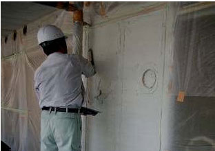 施工は、左官工による特殊ポリマーセメンモルタルの塗り込み作業によっています。このため、騒音・振動・粉塵が非常に少ない利点があり、片側(外側)のみ補強する場合でも補強効果があることを確認していることより、「居住者が住まいながら」の改修工事を可能としています。
