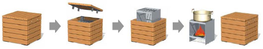 日常は上部を腰掛け板で覆っていて屋外用スツールとして利用でき、災害時には腰掛け板を外すだけで、炊き出しかまどとして使用できます。