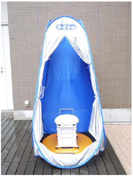 下水道に直結させる非常用のトイレで、災害による断水で住戸のトイレが使えないという悩みを解消します。災害時に敷地内のマンホールのフタを外して、マンホール枠に簡易トイレ(洋式便座)を設置するだけですぐに利用できます。鍵付きテントでプライバシーにも配慮しています。