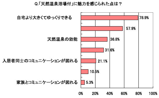 「ステーションテラス若葉」は、大型商業・医療・子育て・公園など生活環境に恵まれた東武東上線「若葉」駅徒歩2分に位置し、安全・安心な構造躯体、防災設備、アフターサービスはもとより、快適な生活を実現する共用施設が充実しています。特に天然温泉浴場に対するお客様(※1)の評価は高く、「魅力を感じる(26%)」と「まぁ魅力に感じる(56%)」を合せて約8割の方が評価しています。天然温泉浴場の"魅力"については、浴場の広さや温泉の効能による'癒し'、'リフレッシュ'、'健康促進'などの効果を期待する声に加え、'光熱費の節約'や'入居者同士のコミュニケーションや親子の絆を深める'といった声が挙がっています。