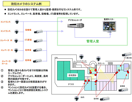 近年、防犯カメラはデジタル化などにより画質や録画時間の向上に加え操作性や運用管理面においても向上しており、またコスト面でも機器の低価格化やレンタル方式等により、導入しやすくなってきております。更に、プライバシー保護がますます重視される中、運用面での工夫も必要であり、これらトータルな形で提案・コンサルティングを行なう事で、管理会社としてサービス向上へ繋げてまいります。