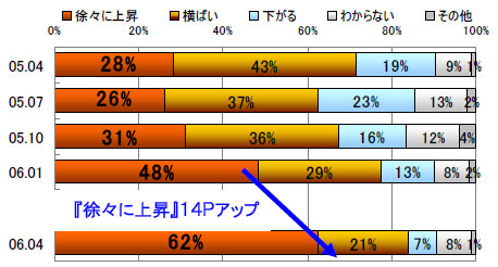 『マンションの価格動向』については、『徐々に上昇すると思う』と回答された方が、大幅に増加し、62%(前回調査時より14Pアップ)。こちらも、約6割のお客様が『上昇』と予測されています。その背景としては、"地価の上昇"に加え、"原油価格の上昇により、資材費が上昇"、"一連の耐震強度偽装問題によりマンションの質が良くなり、価格も上昇"といったことなどが挙げられました。