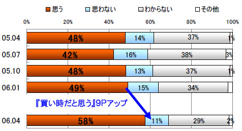 『今はマンションの買い時だと思いますか』という設問に対し、『買い時だと思う』と回答された方は58%。2006年1月時点の調査より9Pアップの大幅増で、アンケート調査を開始した2002年2月以来、最も高い数値を記録しました。『買い時だと思う』理由を見ると、『地価動向』『マンション価格動向』の予測に加え、今後のローン金利の上昇や、消費税の上昇懸念といったマインドがうかがえます。
