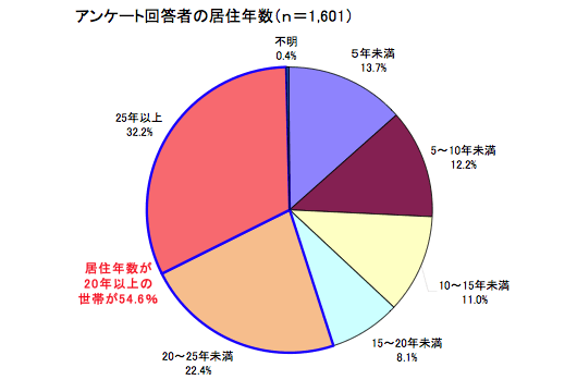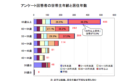 回答者の持ち家比率は93%。世帯主の年齢分布では、60歳以上の世帯が47%と居住者の高齢化が顕著。また家族構成は、全体では「世帯主のみ」と「夫婦」で42%を占め、65歳以上の世帯に限ると65%を占める。居住年数では、「20年以上」が54%と半数を越える一方、「10年以下」も25%を上回り、一定の割合で居住者は入れ替わっている。