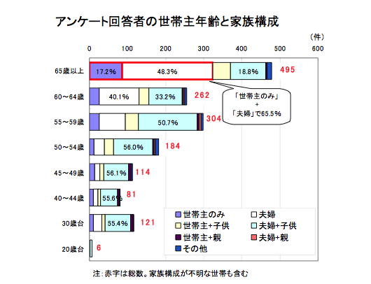 【回答者の年齢・家族】~世帯主60歳以上が47%と予想以上に高齢化が進行(グラフ1)