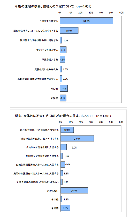 今後の住宅の改善・住替えの予定については、「このまま永住する」が52%で、「リフォームして住みやすくする」18%と合せると70%となり、永住志向は非常に高くなっている。また、将来の身体的に不安を感じはじめた場合の住まいについても、「そのまま住み続ける」と「現在の住宅をリフォームして住みやすくする」が計46%あり、永住志向は根強いものがある。その一方で、「公的・民間のケア付住宅」、「特別養護老人ホーム」、「介護型有料老人ホーム」などへの入居希望も合せて15%あり、『介護の必要な時期』を見据えている居住者も一定割合存在する。