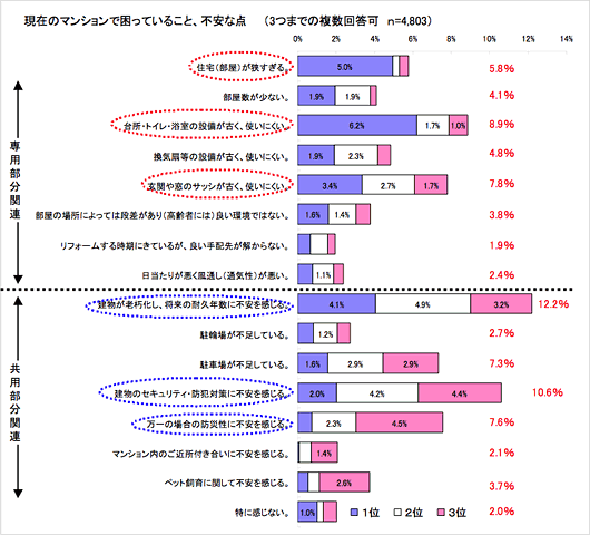 「建物が老朽化し、将来の耐久年数に不安を感じる」が最多。また、優先度の高い項目(1位選択項目)は、「台所・トイレ・浴室の設備が古く、使いにくい」、「住宅(部屋)が狭すぎる」等の専有部分への不満に関する回答が多い。(3項目まで複数回答)
