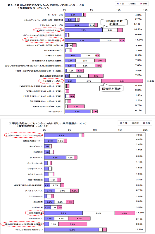 費用が生じても欲しいサービスは、「小修繕サービス」が最多。優先度の高い項目(1位選択項目)としては、「ハウスクリーニングサービス」、「宅配便の発送・受取りなど」の要望が多い。