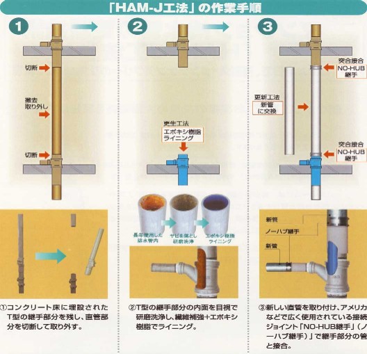 「HAM-J工法」は、当社がこれまでの設計・施工で培った技術ノウハウに、樹脂管更生工法を保有するマルナカ(本社・神奈川県茅ヶ崎市、中尾朝夫社長)と、ライニング鋼管技術をもつジャパン・エンヂニアリング(本社・東京都文京区、南雲一郎社長)の技術を融合させ、新たな排水管更新・更生技術です。