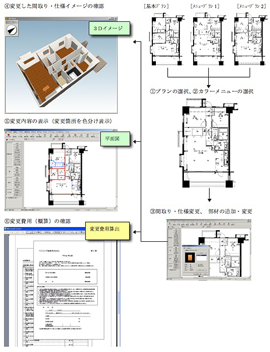 (1)Wiviはより早く柔軟に顧客ニーズに対応するためのシステムで、販売事務所において、担当者がお客様の要望を聞きながらパソコンを操作し、基本プラン・メニュープランから間取り、収納、部材、設備の仕様変更や家具レイアウトの確認などを容易に行うことができます。また変更工事の概算費用も即時に提示でき、変更後のイメージも3D表現で分かり易く確認することができます。