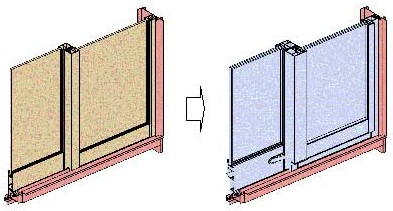 - 既存のサッシ枠をそのまま残し、ペアガラスとサブロックを標準仕様とするサッシ引き戸に交換します。オプションメニューとして、引き戸には開閉が楽なキックハンドル、ガラスは防犯合わせペアガラス、真空ペアガラスなどを用意し、居住者の要望に合わせて自由に組み合わせが可能です。