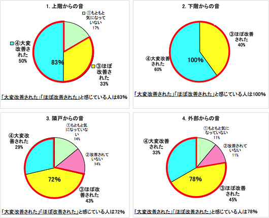 長谷工コーポレーションは、独自に開発した「高遮音二重床」※1や「ハイブリッド高遮音壁」※2などを採用した『高遮音マンション』第1号を完成いたしました。建物完成後に遮音性能を計測した結果、住宅性能表示制度「音環境」の全項目で最高等級以上となる国内最高水準の性能を確認いたしました。また、入居者の方々へのアンケート結果からも、「大変改善された」「ほぼ改善された」と感じている人は【上階からの音:83%、下階からの音:100%、隣戸からの音:72%、外部からの音:78%】と大変高い評価をいただいております。(尚、本物件は非分譲の為、住宅性能表示の申請は行っておりません)