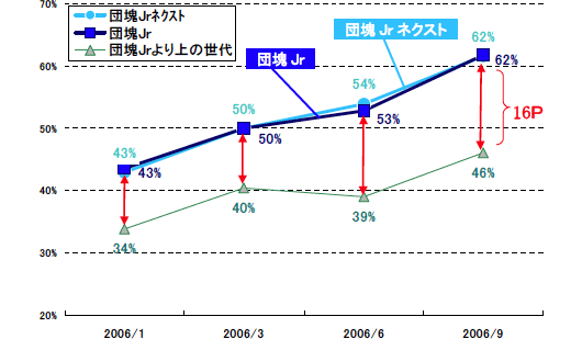 更に世代別にみると、「価格上昇前に購入したい」という回答は、どの世代でも上昇傾向となっていますが、2006年9月には「団塊Jr」・「団塊Jrネクスト」は共に60%を超え、「団塊Jrより上の世代」と比較して16ポイント高い数値となりました。価格上昇の影響を受け易いことが要因の一つと推測されます。