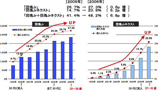 「団塊Jr」・「団塊Jrネクスト」の購入比率は年々増加し、2006年には両者を合わせた購入比率は48.2%(前年比6.8ポイント上昇)となりました。特に「団塊Jrネクスト」の動きが顕著で、購入比率は20.9%(前年比6.2ポイント上昇)となりました。