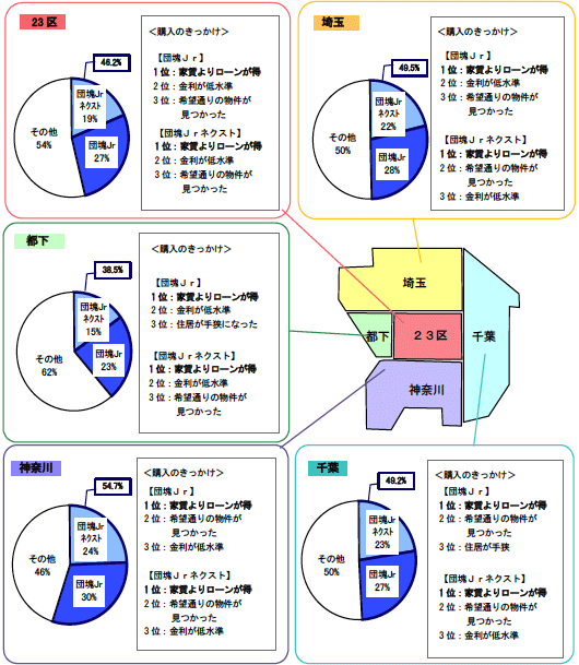 「団塊Jr」・「団塊Jrネクスト」の購入比率をエリア毎に見ると、どのエリアでも概ね 50%前後を占めており、エリアの偏り無く首都圏の全エリアで「団塊Jr」・「団塊Jrネクスト」がマンション購入の主役になっていることが分かりました。