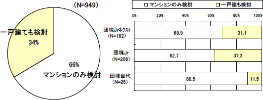 世代別にみると、「団塊Jr」では約37%、「団塊Jrネクスト」では約31%と高い比率を占めました。一方、「団塊世代」では一戸建ても併せて検討した比率は約12%に留まり、マンションのみで検討している人が殆どでした。