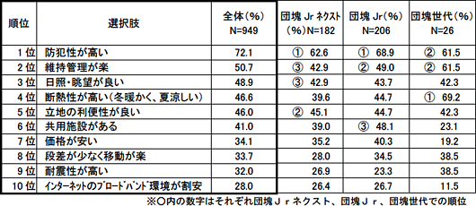 また世代別に見ると、団塊Jrでは「共用施設がある」が第3位、団塊Jrネクストでは「立地の利便性がよい」が第2位となっており、子育て世代ならではの項目が上位となっています。一方、団塊世代においては「断熱性が高い」が第1位となっており一戸建ての居住期間が長い世代ならではの回答結果となっています。