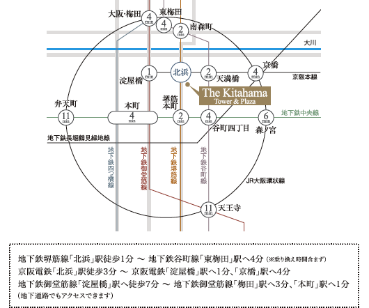 計画地は地下鉄堺筋線「北浜」駅徒歩1分に立地し、しかも駅とプラザ地下一階が直結。地下鉄堺筋線「北浜」駅から外へ出ずに直接建物に入れるため、雨の日でも傘をさす必要がなく快適で、しかも安全な歩行者ルートが確保されています。また、平成20年度開業予定の京阪中之島線「なにわ橋」駅へも徒歩4分です。(駅舎建設中のため多少異なる場合があります)
