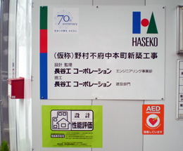 また、AEDを設置した後、作業所ゲート付近の工事看板下等に「AED設置」の表示を行います。当社現場作業所内だけでなく、万が一、作業所周辺で緊急対応が必要になった場合は、一般の人にも使用していただけます。