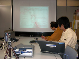 ○プロジェクタを使って壁面やスクリーンに投影することで数十人規模の会議に対応