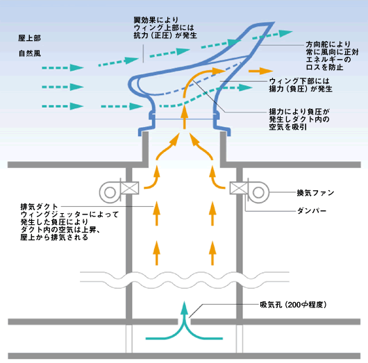 - 飛行機の翼は、工学的な解析に基づいて、風を受けると飛行機が浮き上がるような断面形状に設計されています。WJはこの原理を応用して開発されました。本体の翼部分の断面は、翼形を基本にした流線型をもっており、翼の前面から気流が作用すると、翼には抗力と揚力が発生します。この揚力を最大限に利用し、室内を負圧に変化させ換気を促すようにしています。開発当時、世界7カ国に特許を申請し、従来の換気方式の常識を破るものとして高い評価を得ました。