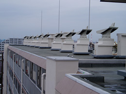 WJシステムは、自然排気方式(注1)でありながら逆流現象の問題も解決した画期的な換気システムで、1974(昭和49)年当時の京都工芸繊維大学教授石原正雄氏(故人)の指導を受けて長谷工が独自に開発しました。WJ本体は飛行機の翼を逆さまにしたような形状で、"翼理論" (注2)を応用し、無限エネルギーである自然風を有効活用することで環境に優しい換気を実現します。わずかな風でも充分な排気能力を発揮し、風速に比例して排気能力が高まる設計となっています。これまでに騒音・逆流などのクレームは全くなく、安価な設置費用でメンテナンスコストもかからず、また素材にはFRP(繊維強化プラスチック)を使用しているため優れた耐用年数を維持しています。