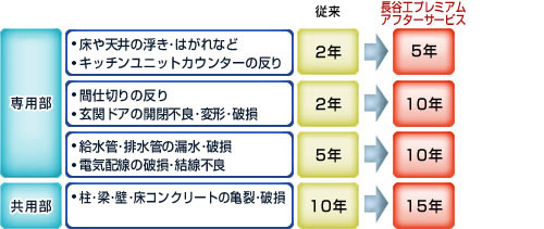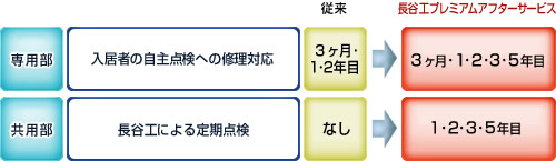 ○マンションの専有部と共用部のアフターサービス期間を、従来よりも大幅に延長。[図―1]