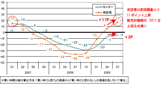 その結果、夏のボーナスの落ち込みによる個人消費への影響が懸念される中、住宅の「買い時感」は、前回調査(2009年4月実施)に続き堅調でした。「買い時感DI」(※)は、来訪者では11ポイント、モニターでは2ポイント上昇する結果となりました。