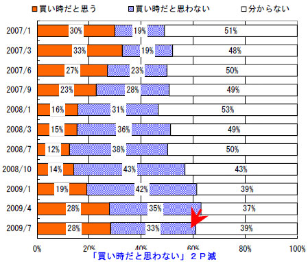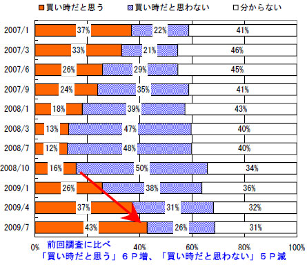 「買い時だと思う」と回答した方は43%となり、前回調査の37%に比べ6ポイントの増加となりました。2008年7月調査の12%を底に4回連続で上昇し、「買い時感」は販売好調期の2007年1月調査を上回る水準となっています。