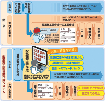 一般的に、鉄筋工事では意匠図・構造図に従い定められた径・本数の鉄筋を所定の位置に配筋施工しますが、その組み手や細かい各所配筋にあたっては、専門工事業者職長のノウハウに依る部分がありました。この「配筋施工図自動作成システム」においては、構造計算データから組み手等も考慮した配筋施工図を当社で作成して専門工事業者に渡すことができるようになるため、配筋施工図の作成業務を省力化するだけでなく、鉄筋工事における生産性の向上と品質の均一化を図ることができます。