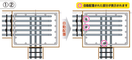 (1)柱と梁、梁同士の鉄筋が上下・位置関係に矛盾を生じないように(特に鉄筋の交差部の組み手が)自動配置します。