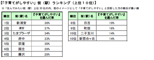 また、今回、住んでみたい街(駅)のイメージとして「子育てがしやすい」と回答した方の割合が高い街(駅)のランキングを行ったところ、『新浦安』『浦安』『たまプラーザ』『府中』が上位となり、都心近郊で「公園や緑地が多く、住環境が整っている事」や「近隣に、必要な施設がコンパクトにまとまっている事」などが評価されています。