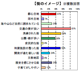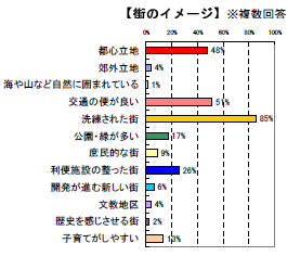 上位5位の『吉祥寺』、『自由が丘』、『横浜』、『鎌倉』、『恵比寿』は、成熟した街としてイメージが確立されており、安定して人気が高いという結果となりました。また、今回調査で10位以内にランクアップした『たまプラーザ』『成城学園前』『池袋』は、最近の駅前の再開発や新線開業により、街の整備が進んでおり、注目度の高まりが評価アップに繋がっている様です。