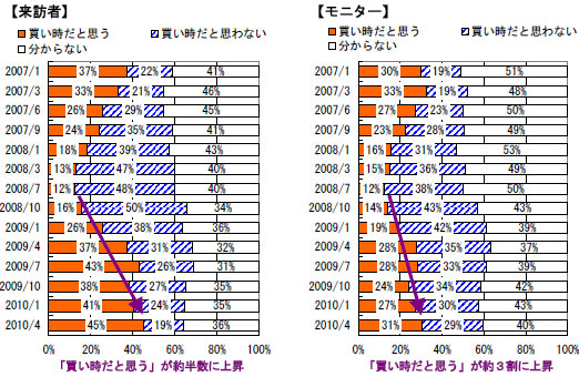 前回調査(2010年1月調査)に比べ、来訪者は9ポイント上昇、モニターも5ポイント上昇し、「買い時感」は更に高まる結果となりました。特に、来訪者はサブプライムローン問題発覚前の販売が好調だった2004~2005年水準まで上昇。モニターについても同様に2007年6月調査水準まで上昇し、約3年ぶりのプラス水準となりました。■住宅の「買い時感」について】(グラフ 2. )