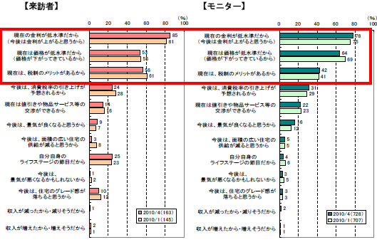 「買い時だと思う」と回答した方の理由は、来訪者・モニターともに「現在の金利が低水準だから」が最も多く、「現在は、税制のメリットがあるから」「現在は価格が低水準だから」、が前回調査に続き上位となり、現在の『買い易い市場環境』が買い時感上昇の要因となっています。また、お客様からは住宅版エコポイント制度など"新たな住宅政策"に関する声や、経済指標や株価の動きなど"景気回復"に関する声が聞かれており、加えて買い時感上昇を後押ししている様子が窺えます。