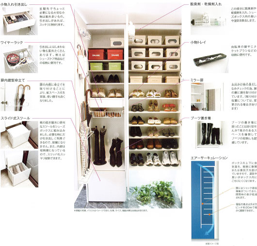 | 「小物トレイ」や「ワイヤーラック」などちょっとしたものの収納や「扉内蔵型傘立て」や「ブーツ置き場」など玄関廻りをすっきり見せるためのスペースを確保し、収納量をアップ。さらに「ミラー扉」や「スライド式スツール」など機能性も兼ね備えたオリジナルシステムシューズボックス。 |