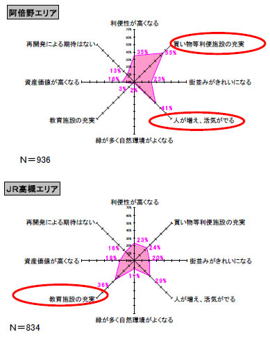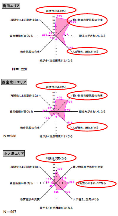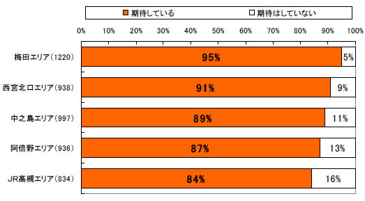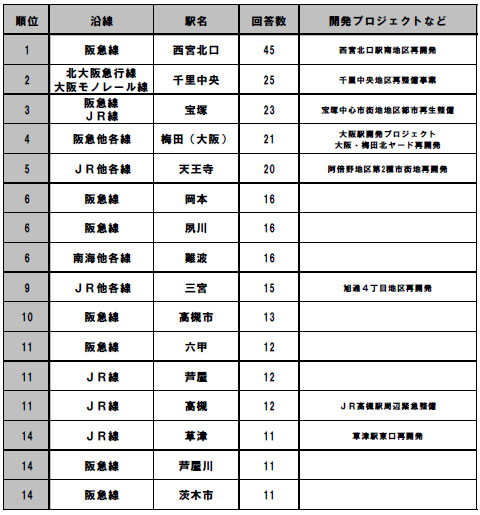 今回の第1位は、2008年11月に「西宮ガーデンズ」がオープンし、再開発により大きく街が変貌した「阪急 西宮北口駅」が2006年調査以来、初の1位となりました。その他の上位の街(駅)でも再開発等により、今後利便性の向上が期待されている街がランクインされました。また、関西圏の中でも再開発等が予定されている「梅田」「西宮北口」「中之島」「阿倍野」エリアは、特に今後の開発への期待値も高いことがわかりました。