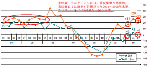 今回の調査は「株価の低下」や「参議院選挙前」という先行きに不透明さが増した中での調査となり、「買い時感DI」(※)は2010年4月調査(以下、前回調査)より下降。但し、堅調にスタートした2010年1月調査水準を上回り、「住宅の買い時感」は、来訪者・モニターともに堅調水準を維持している事が確認できました。