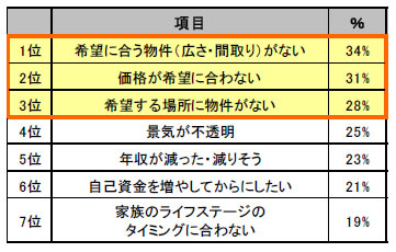 一方、一時見合わせ(様子見)のお客様の理由をみると、来訪者では「希望条件(広さ・間取り・価格・場所)に合う商品がない」が上位となりました。