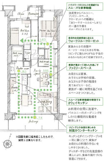 『ミセスマインド』は、「主婦が快適に暮らすための心配りがある住まい」をコンセプトに、スムーズに家事をこなせる間取りや動線計画、家族の団らんが自然に広がり子供に目の届きやすい空間、物がすっきりと片付き空間を美しく演出する収納、機能的で使いやすい設備機器など、家族それぞれの暮らしのリクエストや、住まい手の柔軟な発想を具現化したものです。ミセスマインドを構成する要素は以下の通りです。○間取り・動線・空間