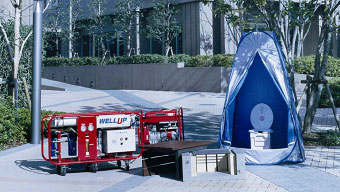 「セントアース」では一般的な防災備品に加え、大震災発生によるライフライン遮断に備えてWELLUP(非常用飲料水生成システム)、かまどスツール、マンホールトイレの防災3点セットを装備しております。