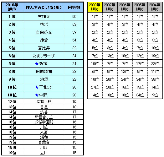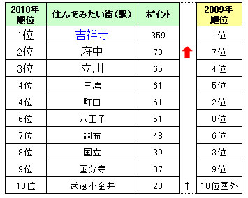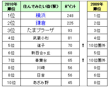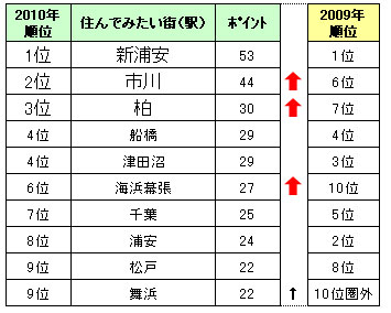 ※表中のポイント右にある黒矢印は、2009年順位が10位圏外かつ今回10位以内にランクインした街(駅)