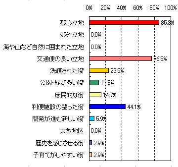 | ●第1位 自由が丘 【住んでみたい理由】 ・街がきれいなイメージがある。通勤にも便利。(33歳 男性 1人家族) ・妻と子供の生活環境にはよさそう。面白そうなお店が沢山ある。(35歳 男性 3人家族) ・買い物が便利で、街並みが好き。(61歳 男性 3人家族) ・明るい垢ぬけたイメージに魅かれます。(55歳 女性 2人家族) ・環境が良く便利だから。(50歳 男性 3人家族) ・洗練された街。都心に近い。休日も充実して過ごせそうなので。(42歳 男性 2人家族) ・おしゃれだけど、ごちゃごちゃしていなくて大人の街だから。(30歳 女性 2人家族) 【街のイメージ】※複数回答