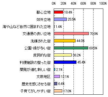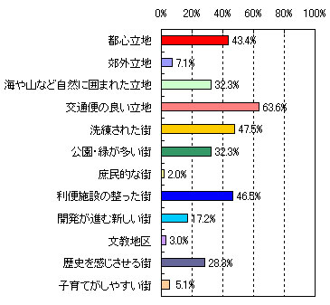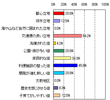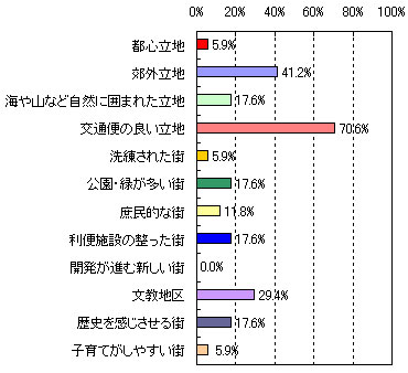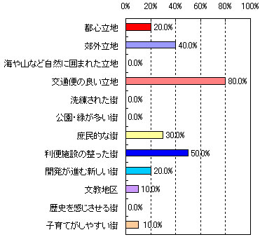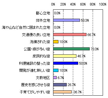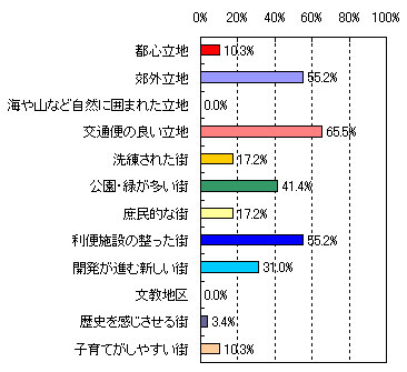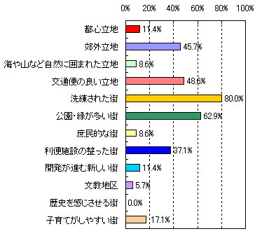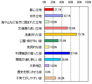 | ●第3位 たまプラーザ 【住んでみたい理由】 ・洗練されていて、都心に出るのが便利。(53歳 男性 5人家族) ・再開発されて綺麗になったこと、また街全体が昔にくらべて活気づいてきた。(33歳 女性 4人家族) ・緑が豊かでセンスのあるお店が多い。治安も良くて上品。空港へ直接のバス便があるのも便利。(59歳 女性 2人家族) ・閑静な住宅地と自然の調和がとれた街だから。(34歳 男性 2人家族) ・再開発が進んで便利になった。(41歳 女性 3人家族) 【街のイメージ】※複数回答
