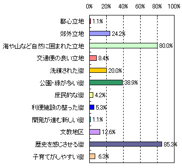 | ●第2位 鎌倉 【住んでみたい理由】 ・海と古い街とが融合しているから。(42歳 男性 3人家族) ・昔からの憧れ。(51歳 男性 5人家族) ・落ち着いた雰囲気で、自然に溢れているから。(35歳 男性 3人家族) ・鎌倉の風情が大好きなので。(42歳 女性 3人家族) ・海が近くてよく遊びに行くから。(41歳 男性 4人家族) ・住み慣れたところに近いし、憧れの街。(52歳 男性 2人家族) ・名所旧跡が多く、海も近い。山間部に住んでいるので海沿いの街に興味がある。(49歳 男性 5人家族) 【街のイメージ】※複数回答