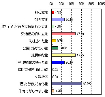 | ●第1位 川越 【住んでみたい理由】 ・観光地になってきて街がきれいになったので。交通のアクセスも良い。(52歳 男性 4人家族) ・古いものと新しいものとが融合しており、都心にも割と近い。(57歳 男性 5人家族) ・福祉などのサービスが充実している。(34歳 男性 3人家族) ・都心に近く、息子の住まいにも近い。(68歳 男性 2人家族) ・駅周辺は開けていて、少しはずれると暮らしやすい静かな所が多そうなので。(27歳 女性 3人家族) 【街のイメージ】※複数回答