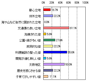 | ●第1位 吉祥寺 【住んでみたい理由】 ・都心へのアクセスも良く街も便利そう。(39歳 女性 3人家族) ・街の雰囲気が落ち着いている。交通の便が良く、都心に出やすい。(35歳 女性 4人家族) ・公園や施設が多く楽しそう。(50歳 女性 3人家族) ・住みたい街ランクで1位の街だから。(33歳 男性 3人家族) ・大好きな街で、小さな頃から色々な思い出がある。すべて揃うので、暮らしやすい環境。都心に近いが、少し離れているので治安が良い。(26歳 女性 4人家族) ・便利だし、きれいな街で、物価もそんなに高くないかも。(26歳 女性 2人家族) ・交通アクセス・ショッピング施設やお店が充実している。(37歳 男性 3人家族) 【街のイメージ】※複数回答