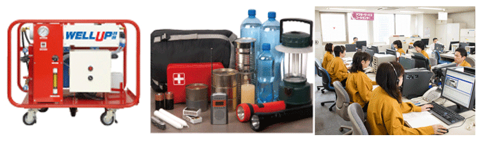 [左:「ウェルアップミニ」、中央:「防災倉庫」の緊急用具、右:「アフターサービスコールセンター」の様子]