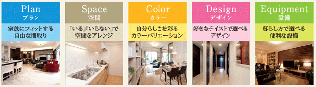 お客様の好みに合わせて住まいのアイテムを選べる「E-label」システムを採用。多彩なカスタマイズ・メニューで、自分流の住まいづくりを楽しめます。